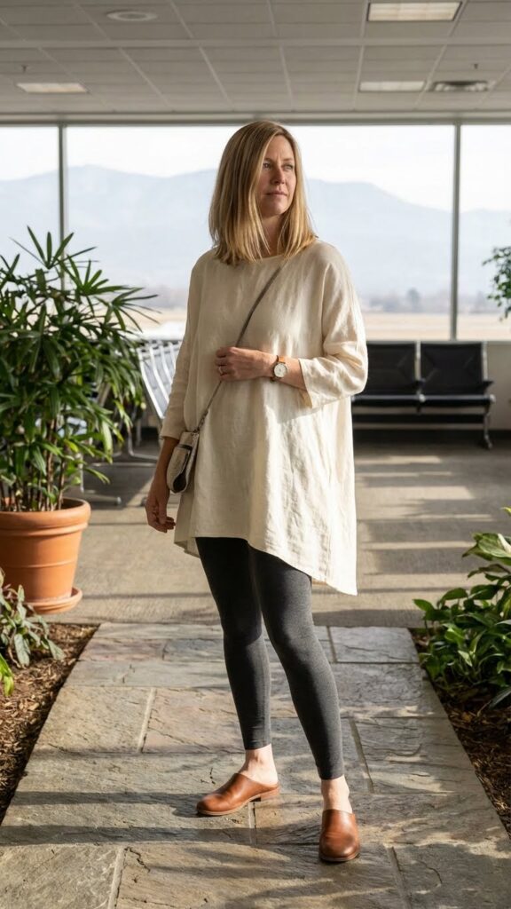 A longer tunic in soft, breathable fabric paired with fitted leggings is your comfy-but-cute uniform for travel days and casual exploring. Think of this as elevated loungewear that you can actually wear in public.