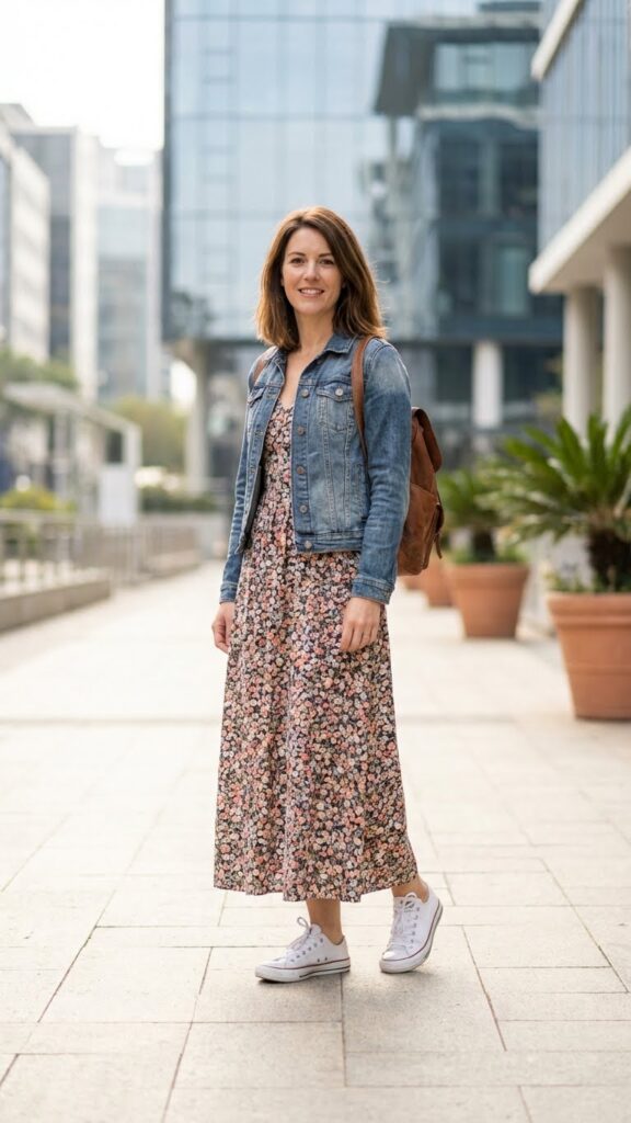 Throw a cropped or classic denim jacket over it for those cooler mornings or air-conditioned museum visits. The contrast between the feminine dress and casual denim keeps things interesting. Go for breathable cotton or jersey fabric so you’re not dying in the afternoon heat. Flat sandals or white sneakers complete the look without trying too hard.