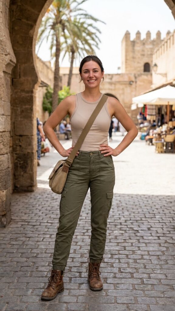 Pair them with a simple fitted tank or sleeveless top in a solid color. This keeps the look from feeling too baggy or shapeless. Olive, tan, or even black cargos work beautifully here. Add a crossbody bag, your comfiest walking shoes, and maybe a lightweight scarf for sun protection. The vibe is casual-cool explorer who definitely knows where she’s going (even if you’re lowkey using Google Maps).