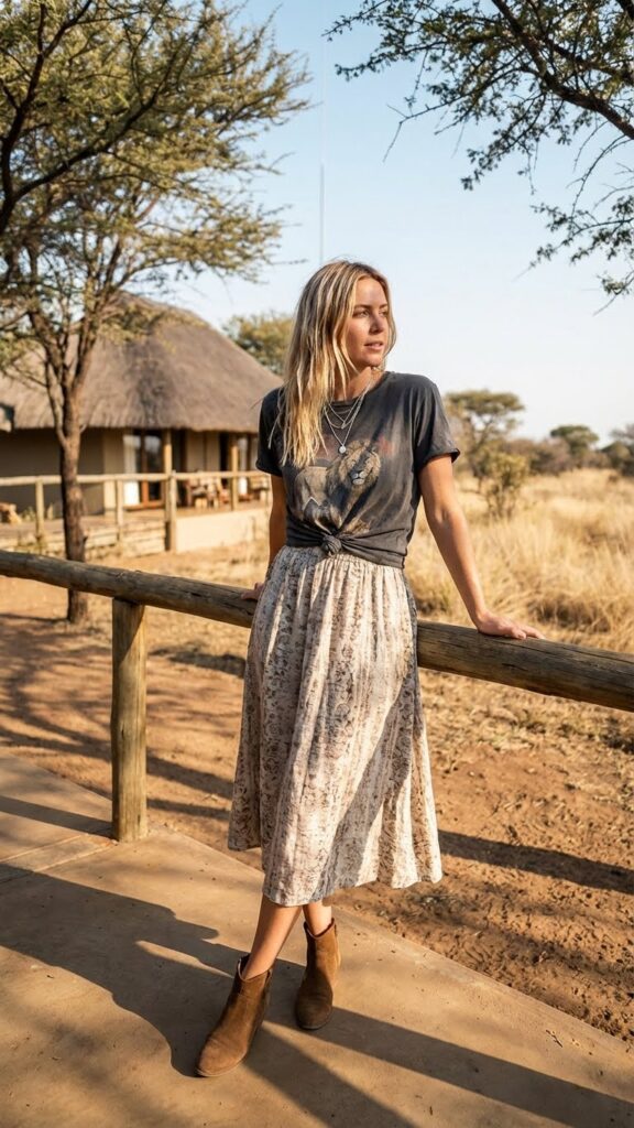 The midi length is key here. It’s long enough to feel appropriate and protect your legs, but not so long you’re tripping over it climbing in and out of safari vehicles. Choose a skirt with some movement, maybe a subtle slit or A-line cut. Your graphic tee keeps things playful and personal. Maybe it references your favorite band, a cheeky saying, or literally just cool typography.