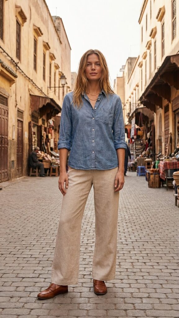 This combo works for safari game drives, exploring historical sites, or grabbing dinner at that restaurant your Airbnb host recommended. The chambray adds just enough texture and interest, while the neutral pants keep things sophisticated. Add loafers or low-heeled mules, minimal jewelry, and you’re done.