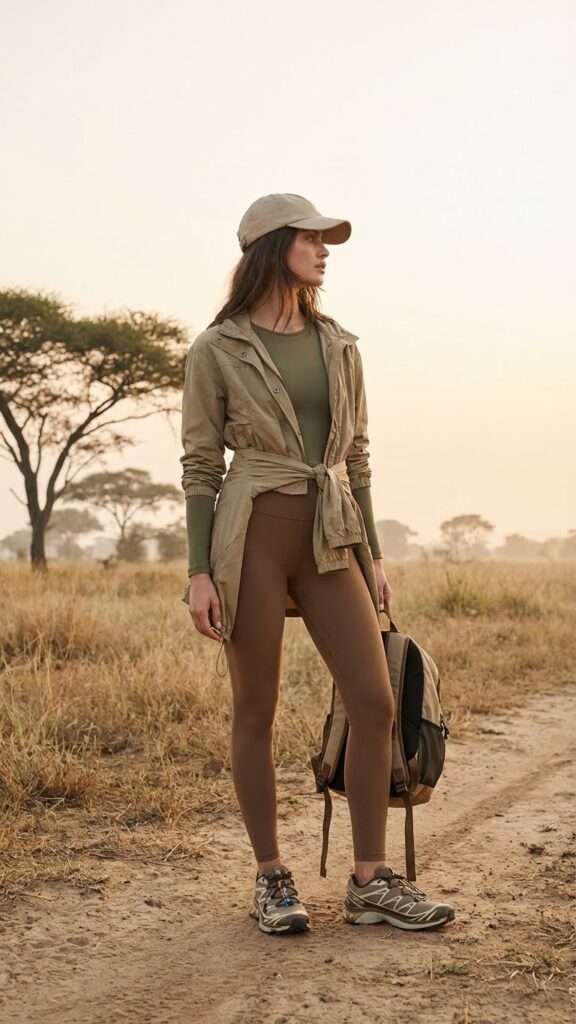 Hear me out. High-waisted leggings or joggers in neutral tones paired with a moisture-wicking long-sleeve top is actually brilliant for active safari days. You get the comfort and flexibility of workout clothes with the sun protection you desperately need.