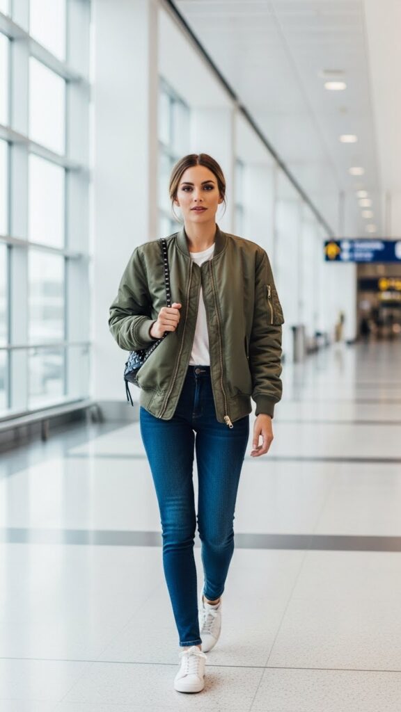 A bomber jacket gives off major cool-girl vibes while being one of the most practical travel pieces ever. Throw it over skinny jeans and a simple tee, and you’re ready to go.