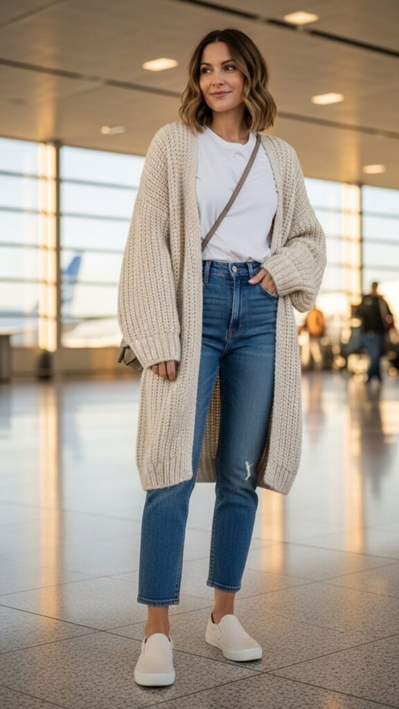 This is peak “I’m traveling but make it cozy.” The high-waisted jeans keep everything tucked in and flattering, while that oversized cardigan is basically a wearable blanket that airport security won’t question. Go for neutral tones like cream, camel, or grey so you look pulled together even when you’re running on two hours of sleep. Slip-on sneakers or mules complete the vibe. Bonus: that cardigan becomes your in-flight blanket, and those jeans have enough stretch that you can eat an entire bag of pretzels without judgment.