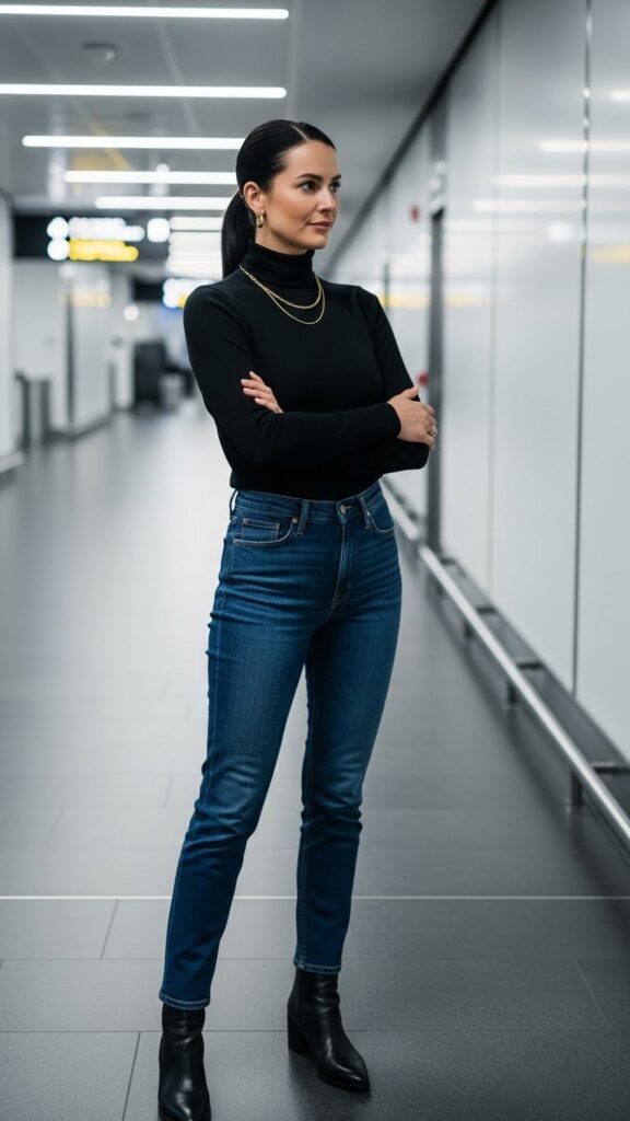 All black everything, but make it travel-friendly. A fitted or slightly slouchy black turtleneck with your darkest jeans is that effortlessly chic formula that works every single time.
