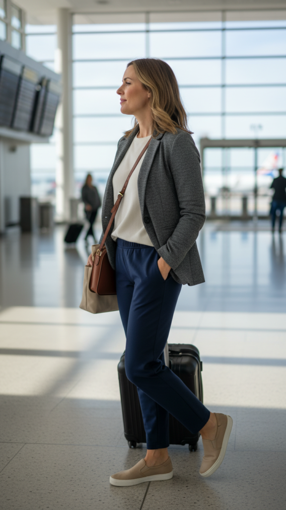 Complete the look with slip-on shoes and a structured tote. You’ll move freely through terminals while looking polished and put-together.
