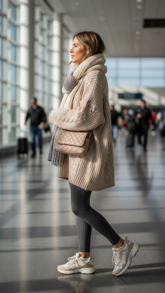 Choose a chunky knit cardigan that doubles as a blanket during long flights. High-waisted leggings provide comfort without sacrificing style, while supportive sneakers keep your feet happy during terminal walks. This combination creates chic seasonal looks that work beautifully for winter travel while maintaining comfort throughout your journey.