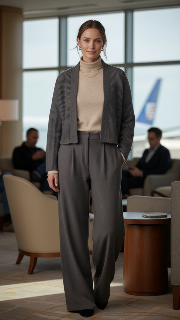 You’ll appreciate how a fitted turtleneck sweater creates a polished foundation while providing essential warmth during chilly terminal walks. Wide legged trousers offer unrestricted movement through security lines and cramped airplane seats without sacrificing elegance.