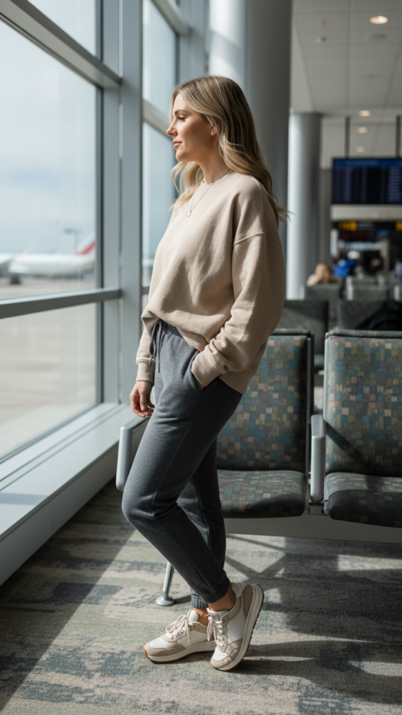 Choose neutral colors like charcoal, navy, or beige that hide travel stains while maintaining a put-together appearance. This combination creates an effortlessly trendy travel look that’s perfect for capturing Instagram-worthy airport photos. Complete your look with comfortable sneakers or cozy slippers for easy security removal. This outfit works perfectly for red-eye flights when you want maximum comfort without sacrificing style throughout your entire trek.