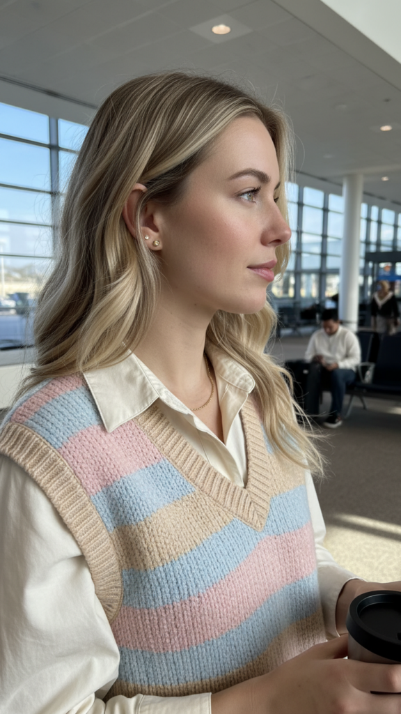 Choose a lightweight cotton or linen button-up in white or soft pastels for breathability. Layer a chunky knit vest over top for instant coziness that’s easy to remove during security checks. These cozy layers adapt perfectly to changing cabin temperatures while maintaining a put-together look that moves effortlessly from departure gate to destination arrival.