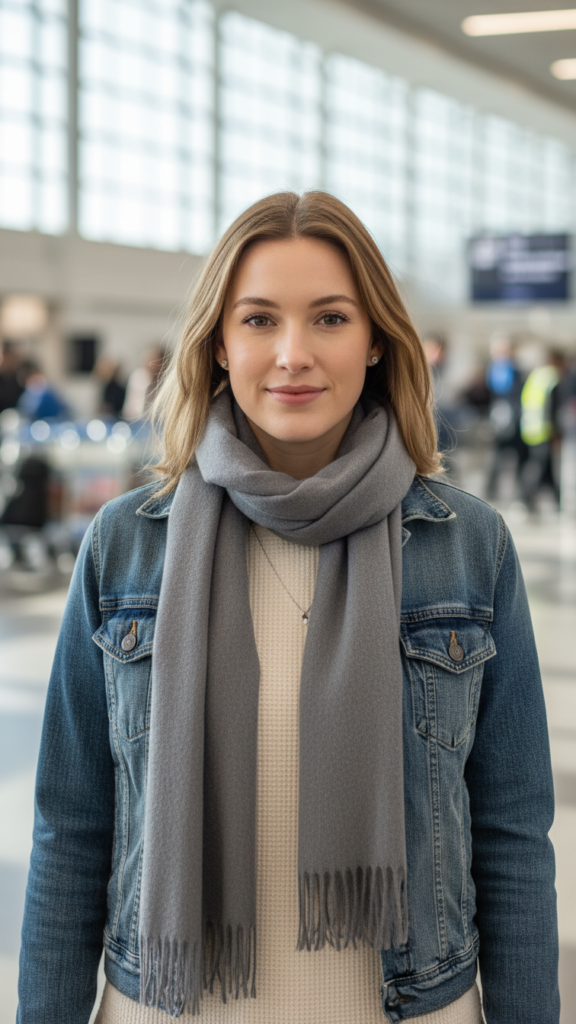 Layer your thermal base with a classic denim jacket that’s easy to remove during security checks. Complete the look with thermal accessories like a lightweight cashmere scarf that doubles as a blanket during flights. This versatile outfit shifts seamlessly from chilly outdoor weather to climate-controlled airports while maintaining that casual-cool aesthetic you’re after.