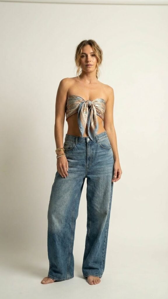 Okay, this one requires a bit more confidence, but the payoff is worth it. A silk scarf tied as a halter or bandeau top with baggy jeans is incredibly editorial. It’s the kind of outfit that stops scrolling and makes people save immediately.
