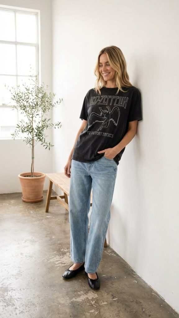 Is there anything more perfectly Pinterest than a worn in band tee tucked into light wash baggy jeans? This outfit is basically a love letter to the effortless aesthetic that makes everyone double tap. The ballet flats add an unexpected feminine twist that keeps things interesting.