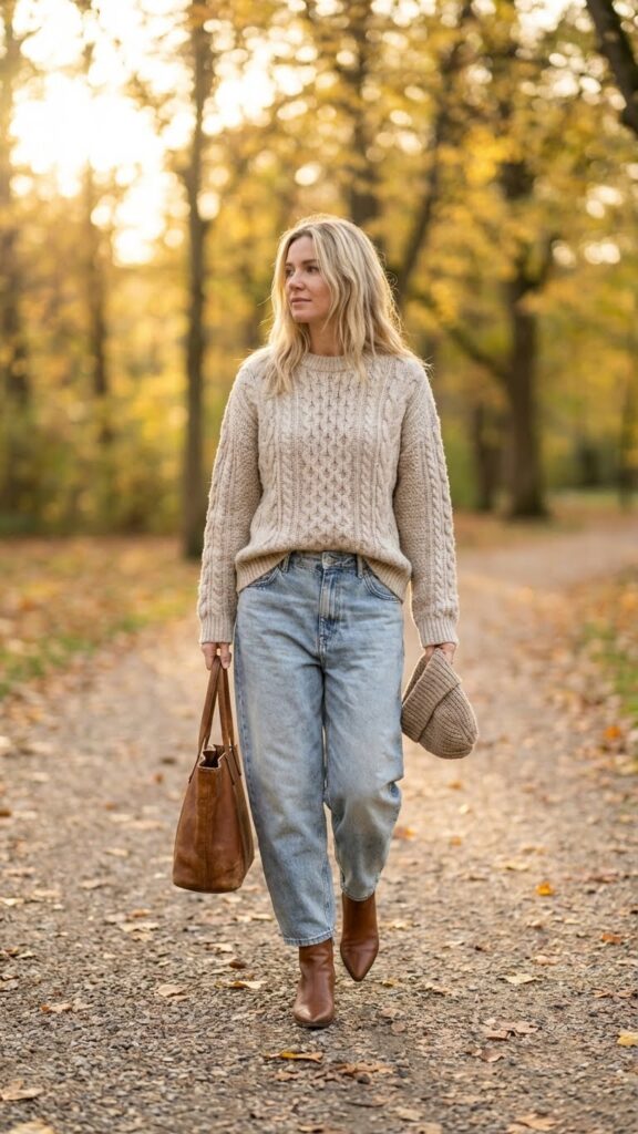 When the weather gets a little cooler and you want to live in knitwear, this combination delivers. A chunky or ribbed sweater in cream, camel, or forest green pairs beautifully with baggy jeans that have a slight vintage wash. It’s comfort food but make it fashion.