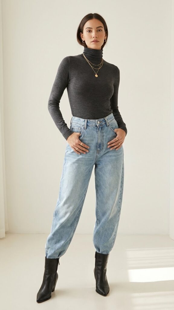 There’s something incredibly sophisticated about a fitted turtleneck tucked into high waisted baggy jeans. It’s clean, it’s polished, and it photographs like a dream. This is the outfit for when you want to look expensive without actually spending money.