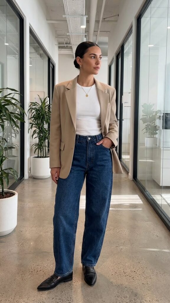 Add loafers or oxford shoes to lean into that menswear-inspired vibe, and maybe throw on some gold jewelry to soften it up. This look toes the line between edgy and professional in the best way possible. It says you know the rules but you’re not afraid to bend them a little. Just make sure your jeans are a darker wash—light blue denim is harder to pull off in this context.