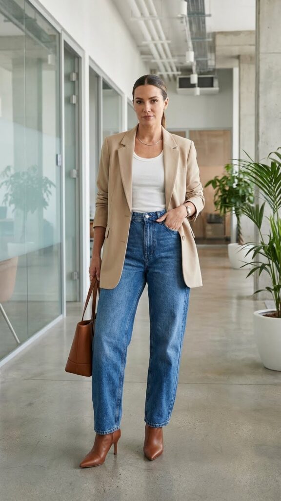 The key here is contrast. Your jeans are relaxed and slouchy, so your blazer should be structured and fitted through the shoulders. Add a simple white tee or a silky camisole underneath, and finish with pointed-toe flats or loafers. This look screams effortless sophistication without trying too hard. Plus, you can literally wear this to a client meeting or happy hour—just swap the flats for heels and you’re golden.