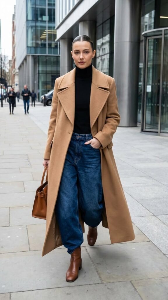 Think oversized trench coats, long wool coats, or even a structured camel coat. Keep everything else simple—a fitted black turtleneck, your baggy jeans, and sleek ankle boots—and let the coat do the heavy lifting. This works especially well for commutes or any situation where you’ll be wearing your coat for a while. You walk in looking like a total boss, and when you take it off, you’re still appropriately dressed for the office. Win-win.