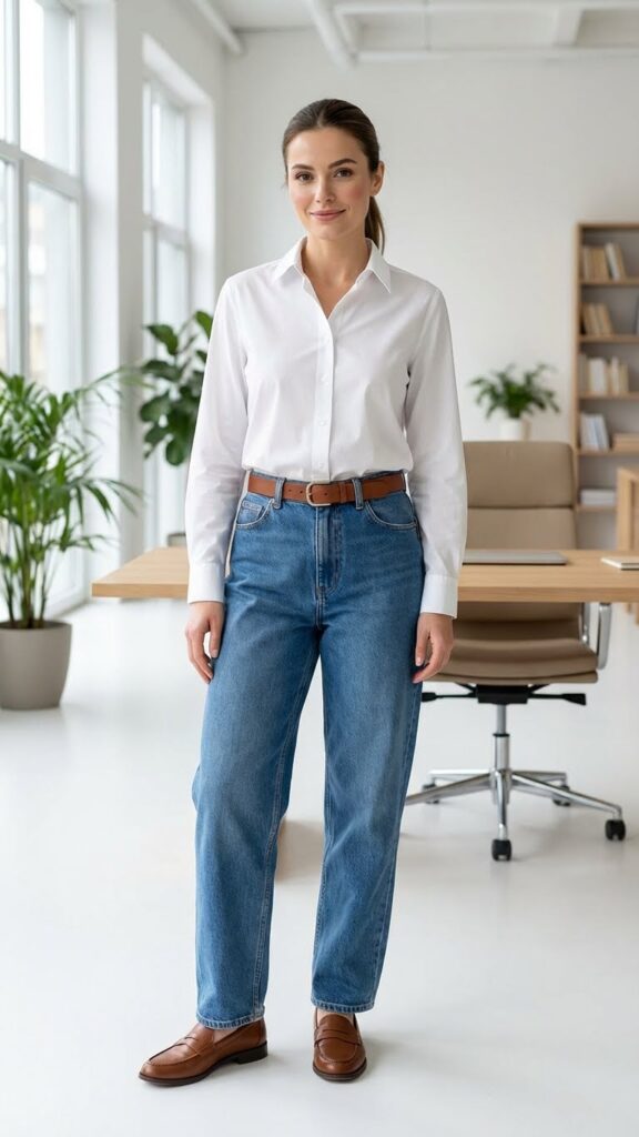 The belt is crucial here because baggy jeans can sometimes make you look shapeless if you’re not careful. A simple leather belt in black or brown does the trick. Finish with loafers or mules—both give off serious “I know what I’m doing” vibes. This outfit is perfect for days when you need to look professional but don’t want to overthink it. Reliable, timeless, and always appropriate.
