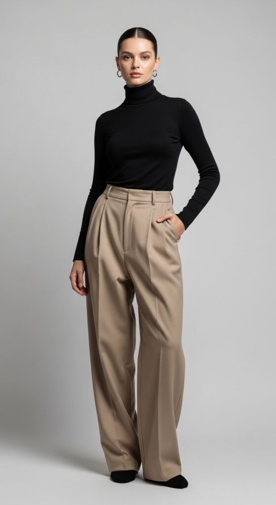 The turtleneck and baggy trousers combination is giving sophisticated art collector energy. It’s sleek, it’s polished, and it requires approximately zero effort to pull off. Just tuck, smooth, and go.