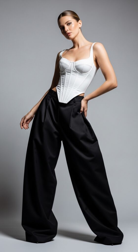 This look leans more evening appropriate, but you can tone it down with a blazer or jacket thrown over for daytime. The corset defines your waist while the trousers add that fashion-forward edge. It’s bold, it’s modern, and it’s absolutely conversation-starting.