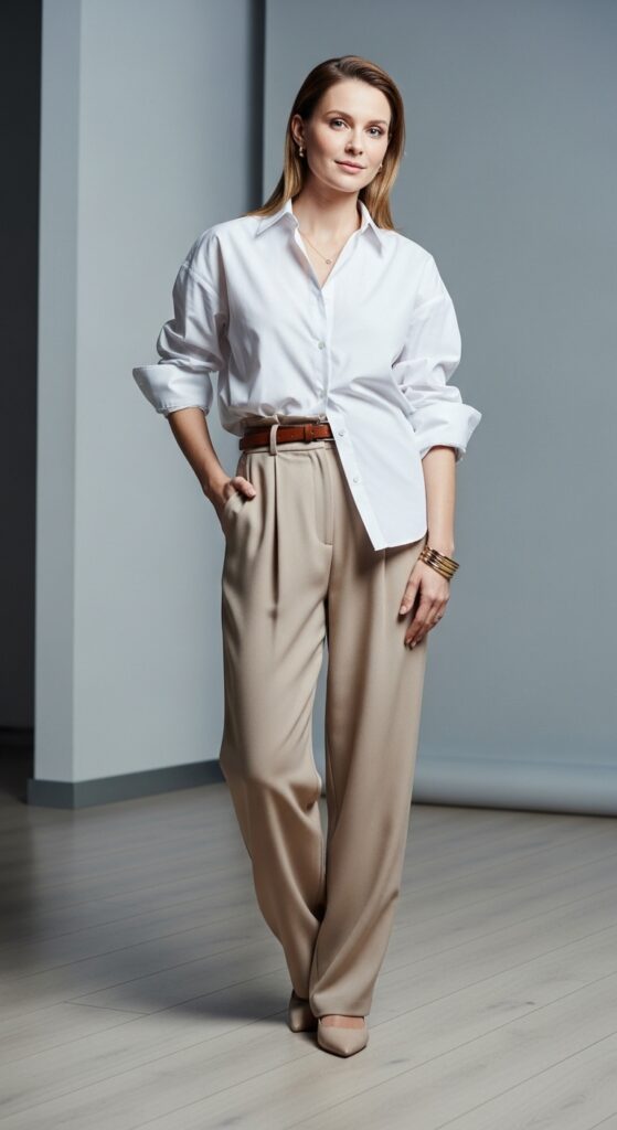 Belt it for waist definition, or leave it untucked for a more casual approach. Either way works. This look transitions seamlessly from office hours to happy hour, which means less outfit changes and more time for actual living. Efficiency, baby.