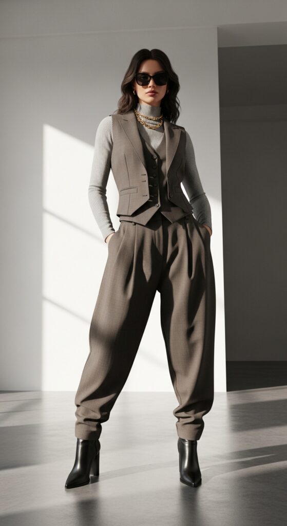 Vests are back and they’re not just for grandpas anymore. A tailored vest over a simple tee or turtleneck, paired with baggy trousers, creates this incredibly chic androgynous look. It’s giving fashion editor at a very cool magazine.