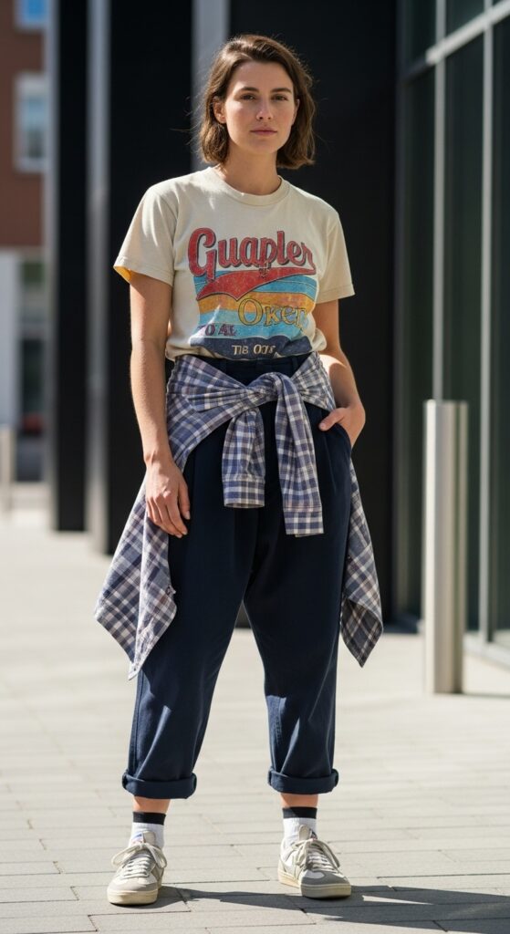 Baggy trousers don’t always have to be dressy. Sometimes you just want to pair them with your favorite band tee and call it a day. And you know what? That works beautifully. The relaxed fit of the trousers matches the casual energy of a graphic tee perfectly.