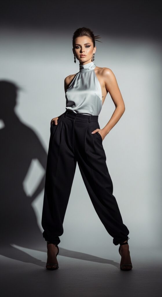 For those nights when you want to turn heads, a halter top with baggy trousers creates the most stunning contrast. All that skin on top, all that fabric on the bottom. It’s dramatic, it’s elegant, and it’s somehow still comfortable enough to actually enjoy your evening.