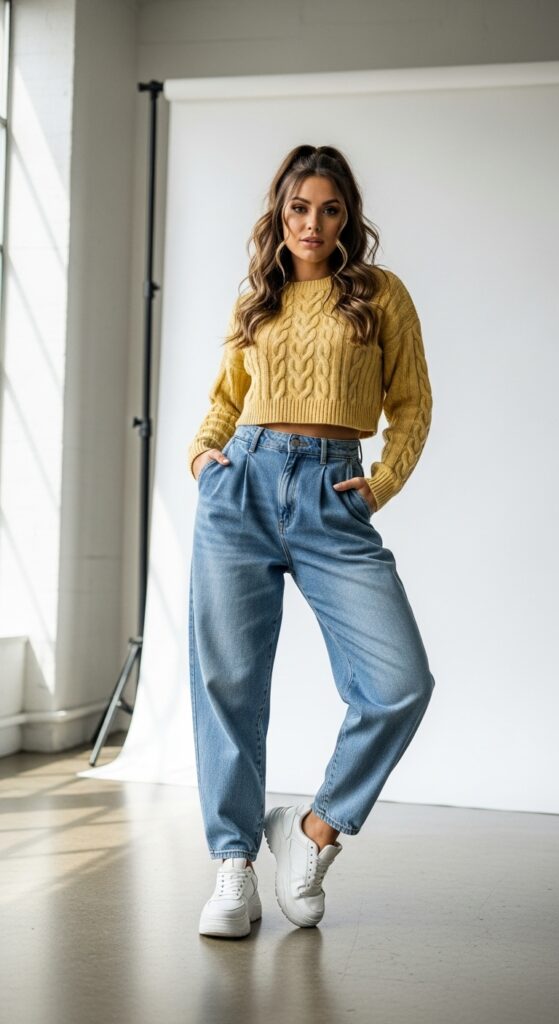 This combo is what I like to call “accidentally cute.” You know those days when you want to look put-together but also need to be able to sprint to catch the bus? Yeah, this is your outfit. Pair your balloon trousers with a cropped sweater that hits right at your natural waist—this creates the most flattering silhouette and shows off that cool tapered ankle situation the trousers have going on. Throw on your favorite chunky sneakers (white ones are chef’s kiss for this) and you’ve got a look that screams “I woke up like this” even though you definitely didn’t.