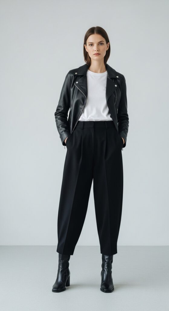 Sometimes the most classic combinations are the best ones, and this is proof. A leather jacket thrown over a white tee and balloon trousers is that perfect mix of edgy and effortless that never goes out of style. The structured, tough-girl vibe of the leather jacket contrasts beautifully with the soft, flowing shape of the trousers, creating a balanced look that’s equal parts cool and comfortable.