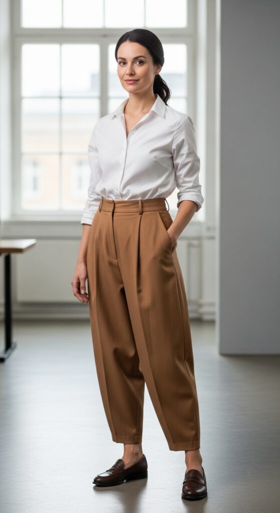 Want to look like you mean business without actually wearing a boring suit? This is your answer. A crisp button-down tucked into high-waisted balloon trousers gives you that polished, sophisticated vibe that says “I have a 401k and I know how to use it.” Go for a classic white shirt or switch it up with a striped or colored one if you’re feeling spicy.