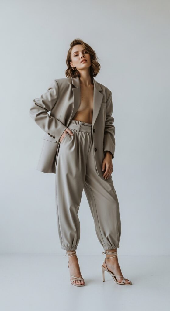 Here’s where it gets fun: add strappy heels to dress the whole thing up. Suddenly you’ve gone from casual Friday to Saturday night dinner vibes. I love this combo because you can wear the same base outfit (trousers and blazer) but completely change the mood with your shoes. Sneakers make it daytime, heels make it evening—it’s like getting two outfits for the price of one. Throw in some statement earrings and a sleek clutch, and you’re ready for literally any occasion that requires you to look like you have your life together.