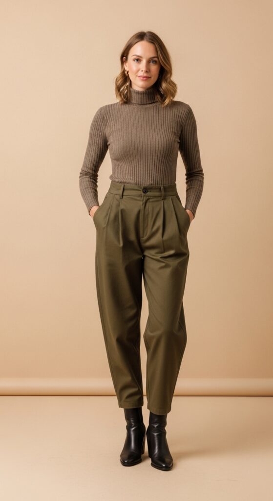 Is it even autumn if you’re not living in turtlenecks? This combination is cozy-chic perfection. A fitted turtleneck (bonus points if it’s ribbed) tucked into balloon trousers creates this gorgeous hourglass shape that’s flattering on everyone. The slim fit of the top contrasts beautifully with the volume of the pants, and honestly, it just makes you look really expensive.