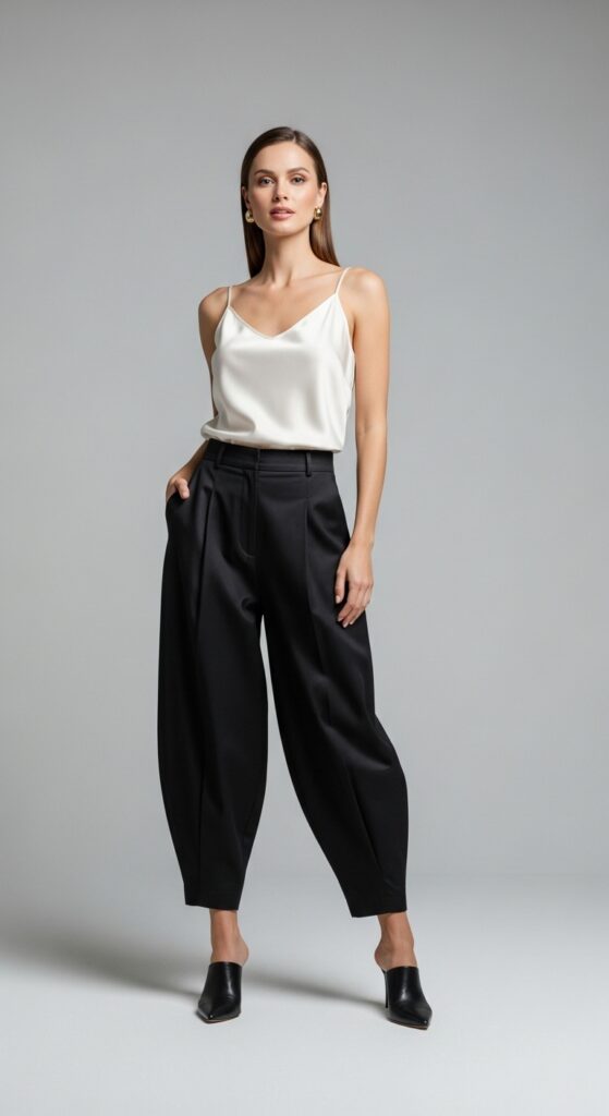Okay, this one is for when you want to feel fancy but not like you’re trying too hard. A silk or satin cami tucked into balloon trousers is luxe without being over the top. The shine of the fabric elevates the entire look, and the drapey nature of both pieces creates this really elegant, flowing silhouette that moves beautifully when you walk.