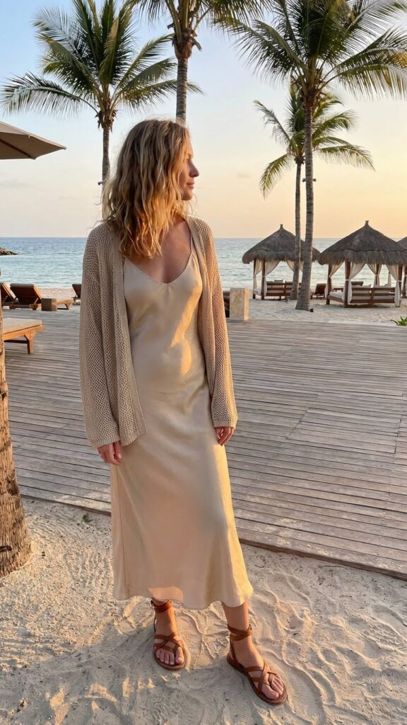 Even in paradise, sometimes you need a layer. A lightweight knit cardigan over a simple slip dress is perfect for those breezy evenings or overly air-conditioned restaurants. The slip dress on its own is minimal and sleek, and the cardigan adds texture and warmth when needed.