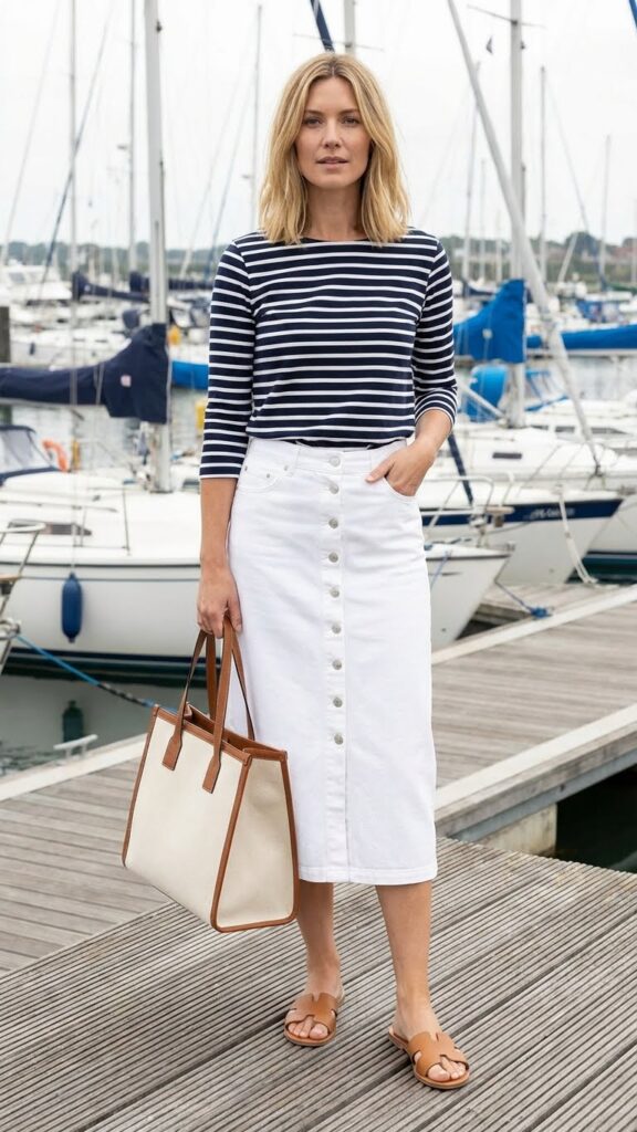The striped top should be fitted or slightly relaxed, not oversized for this look. You want it to tuck nicely into the skirt to create some shape. For the skirt, a knee-length or midi style in crisp white denim keeps things polished but still vacation-appropriate.
