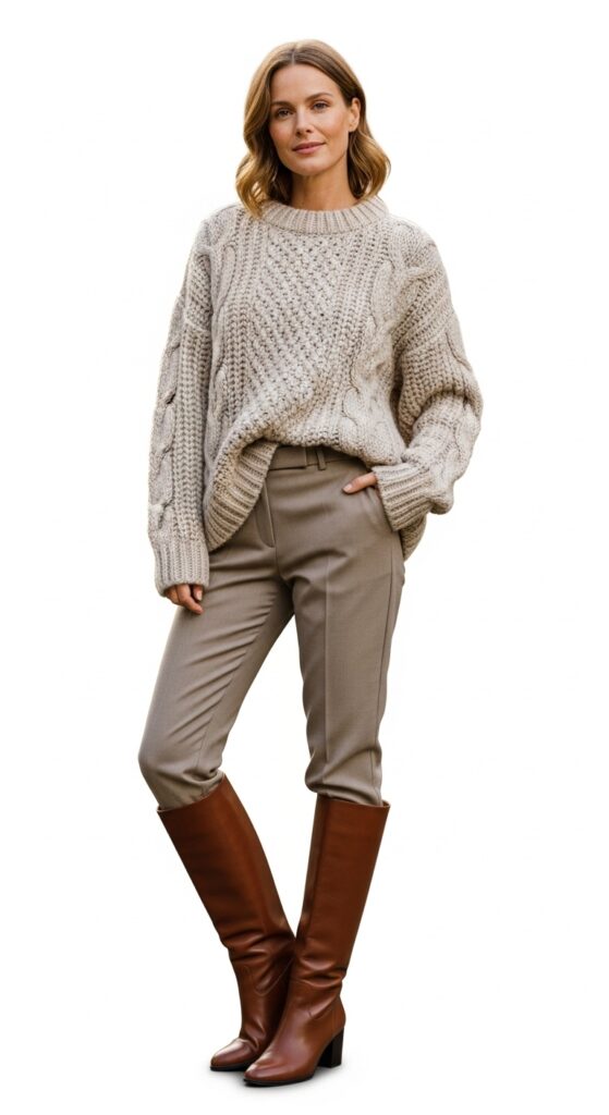 This combo is basically a warm hug in outfit form. There’s something about an oversized chunky knit tucked loosely into beige trousers that just screams “I have my life together” even when you absolutely do not. Add knee-high boots and suddenly you’re giving main character energy.