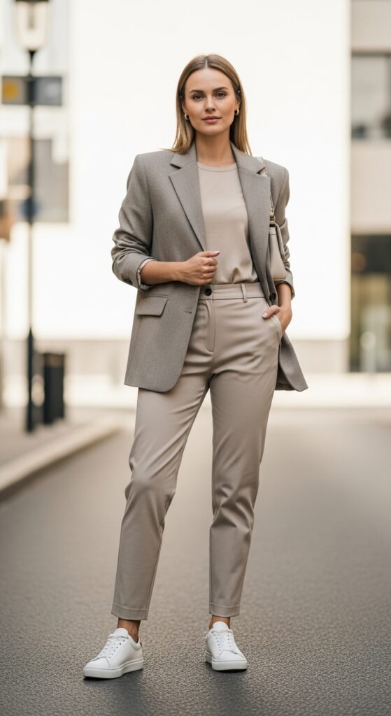 Here’s where things get fun. A tailored blazer with beige trousers sounds corporate, right? But throw on some fresh white sneakers and suddenly you’re cool, not corporate. It’s all about that unexpected twist.