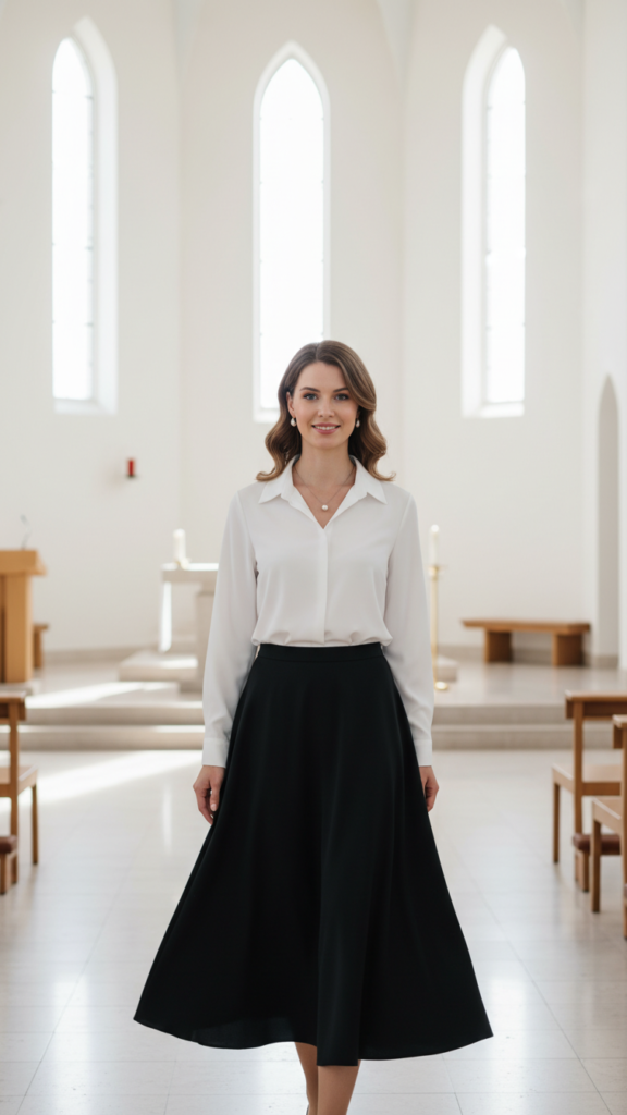 Choose a crisp cotton blouse with clean lines and pair it with a knee-length A-line or pencil skirt. The clean styling creates an elegant foundation that embodies both sophistication and reverence. This versatile outfit moves seamlessly from morning worship to afternoon fellowship events.