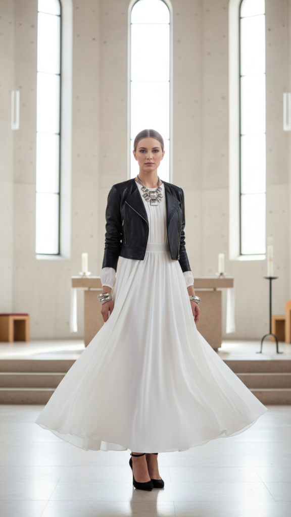 Enhance your Sunday worship attire with a white maxi dress and black cropped jacket that embodies timeless elegance and spiritual grace. This versatile combination offers perfect coverage while maintaining a modern silhouette that’s both respectful and stylish.
