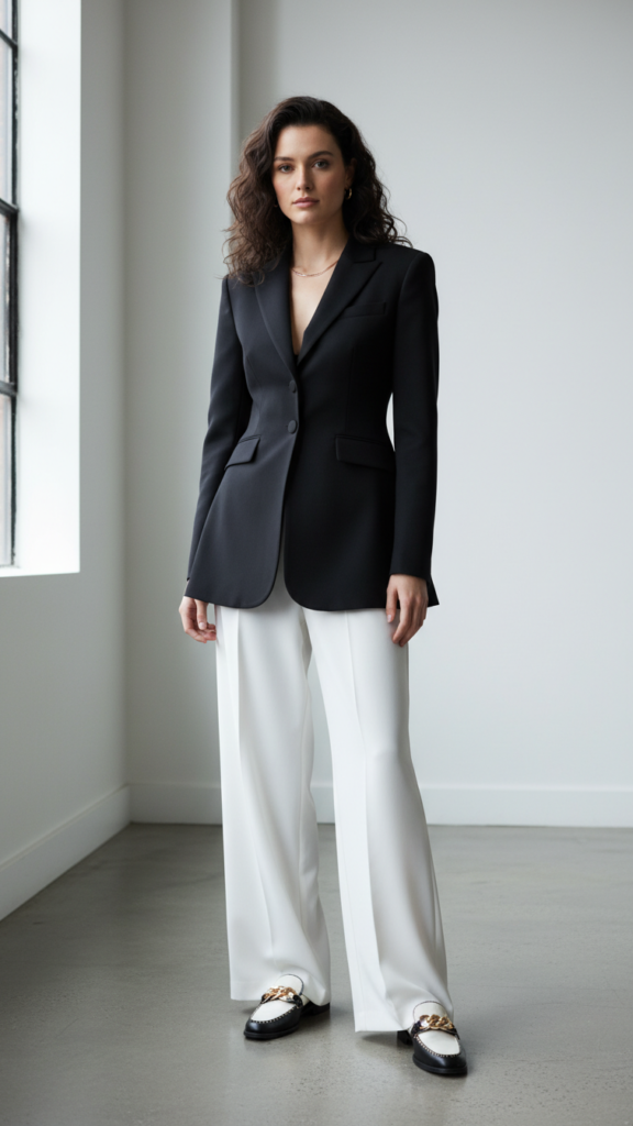 For those who prefer a more contemporary approach to church dressing, a black blazer paired with white wide-leg trousers offers a refined alternative to traditional skirts and dresses. This outfit combination gives you the freedom to move comfortably while maintaining an appropriately reverent appearance.