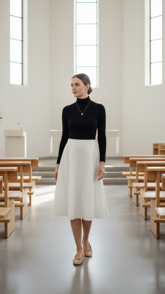 The timeless combination of a black turtleneck with a white A-line skirt creates an effortlessly chic church outfit that balances modesty with modern sophistication. This versatile pairing embodies minimalist elegance while allowing you complete freedom to express your personal style through thoughtful details.