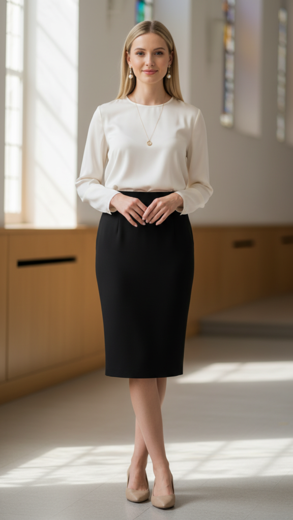 When paired with a cream silk blouse, a black pencil skirt creates a sophisticated foundation that’s both professional and worship-appropriate. You’ll achieve effortless elegance by tucking the blouse neatly into your skirt’s waistband.