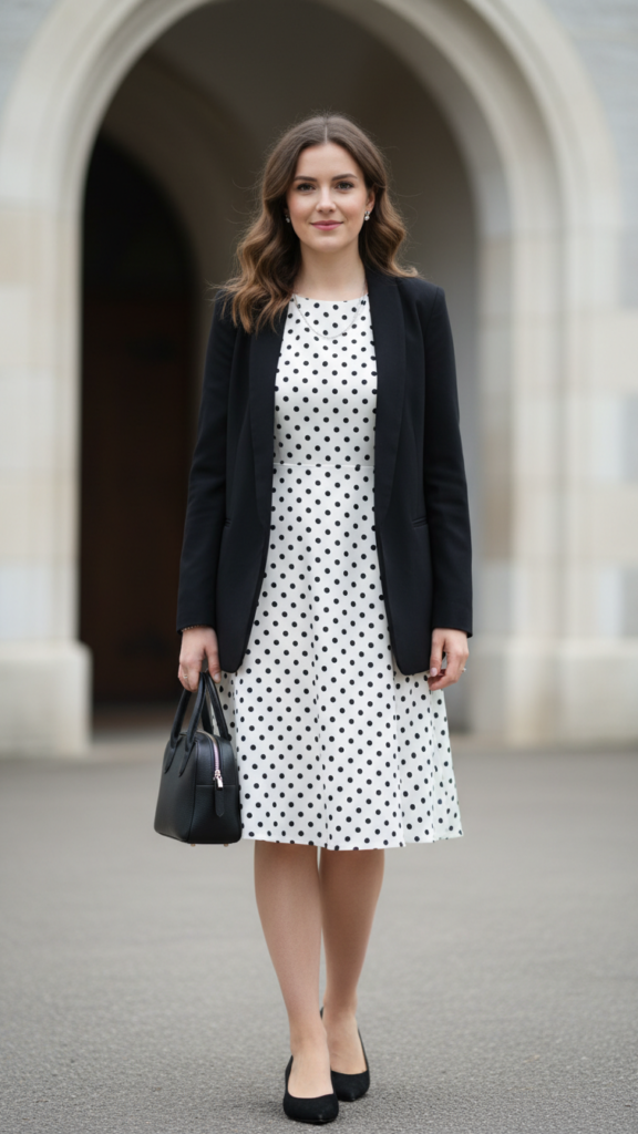 A monochrome polka dot dress paired with a black blazer strikes the perfect balance between playful sophistication and church-appropriate modesty. You’ll love how this combination lets you express personality while maintaining reverence.