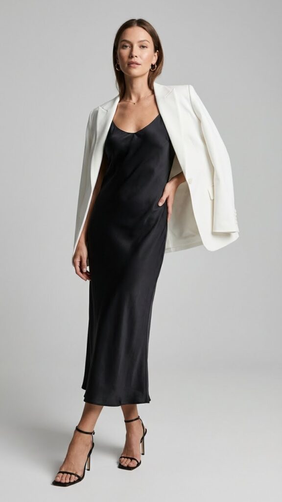 This combo is giving main character energy, and I’m here for it. A silky black slip dress on its own? Gorgeous. But throw a crisp white blazer over your shoulders, and suddenly you’re the person everyone’s asking, “Wait, who is she?”