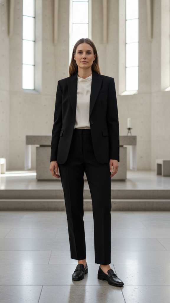 A classic black blazer paired with customized trousers creates an effortlessly sophisticated foundation for church services that never goes out of style. You’ll appreciate how this monochromatic color scheme eliminates guesswork while providing maximum impact.