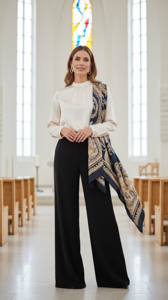 While dresses offer timeless elegance, palazzo pants paired with a silk blouse create an equally sophisticated alternative that’s perfect for contemporary church services.