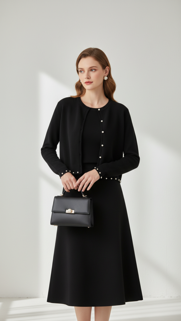 Elevating your church wardrobe becomes effortless with a black cardigan set adorned with delicate pearl accents that add refined elegance to your Sunday worship attire. You’ll appreciate how pearl embellished details convert a simple twin set into sophisticated church wear that commands respect while maintaining appropriate modesty.