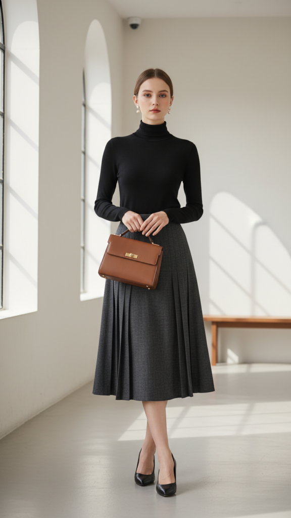 For those seeking sophisticated separation pieces that offer styling flexibility, black turtlenecks paired with pleated skirts create an effortlessly polished church ensemble. This combination allows you to express personal style while maintaining appropriate coverage and elegance.